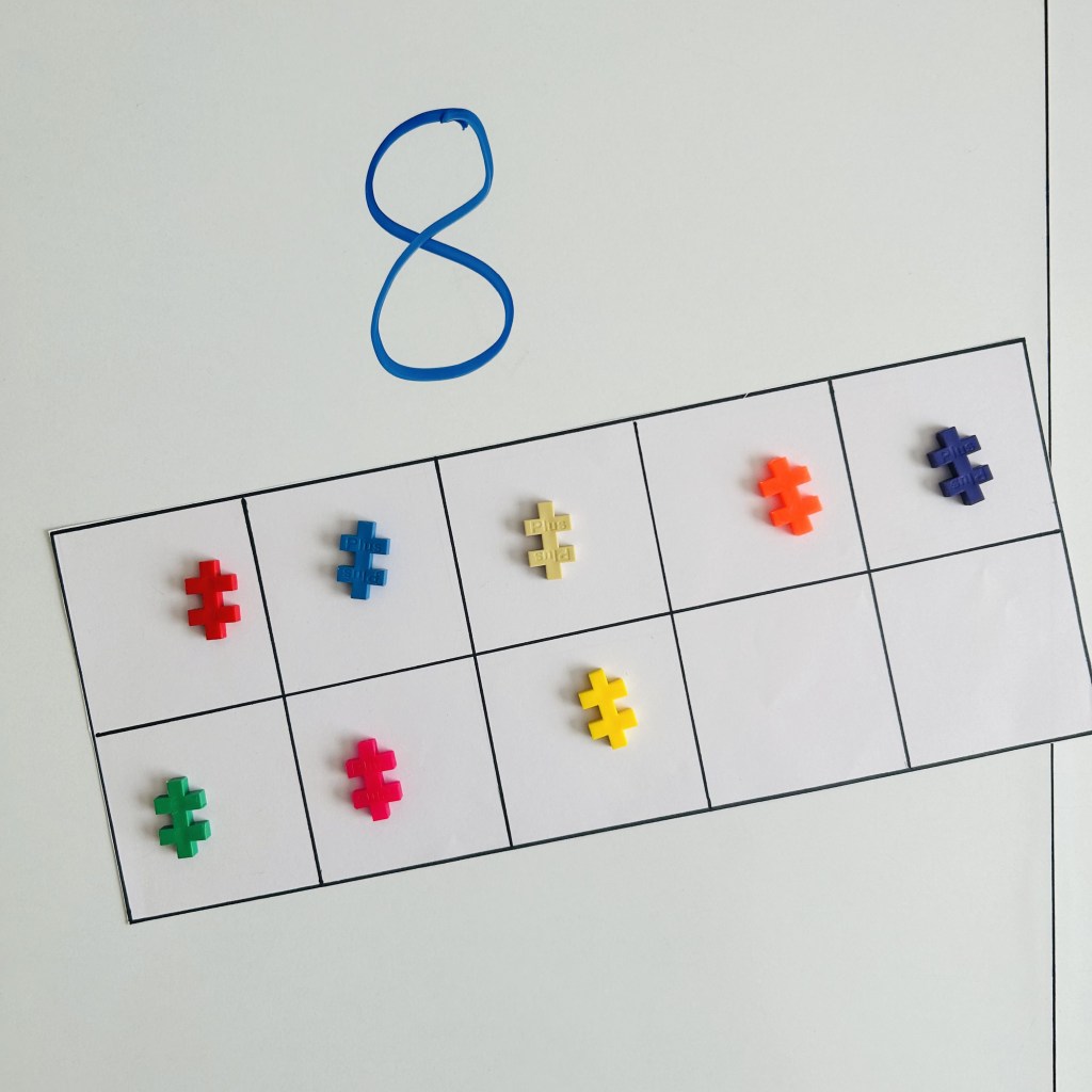 - For counting practice – Fill the ten frame with different numbers of counters and ask the child to count how many are present or how many more are needed to reach 10.