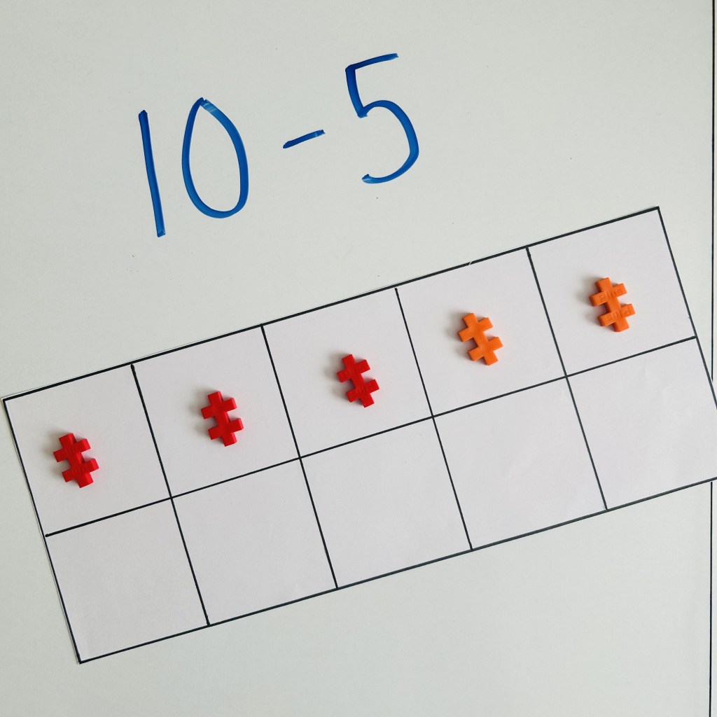 - For Subtraction – Start with a full ten frame and ask children to remove a specific number of counters. Then, ask them how many are left.