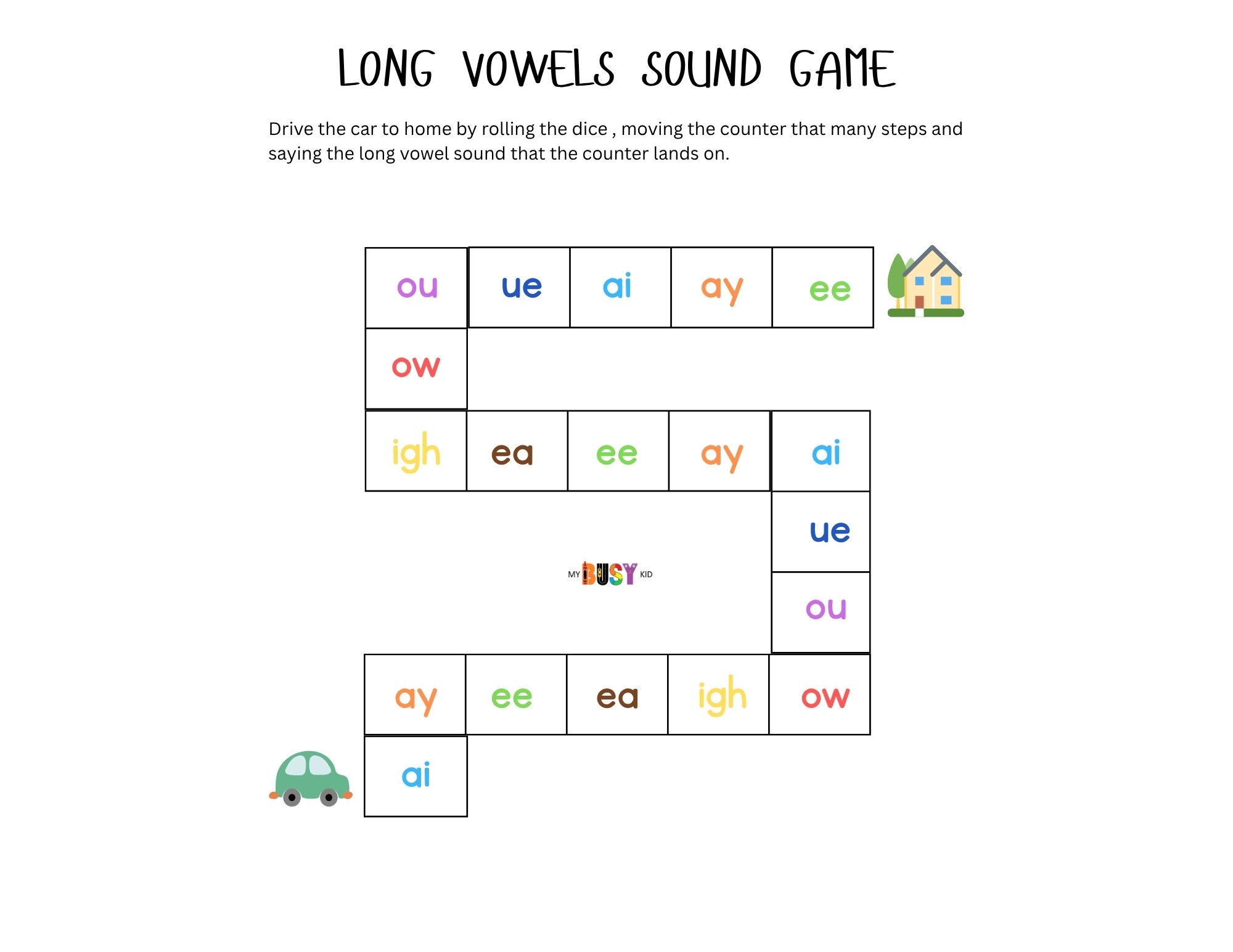Kids roll the dice, move their counter that many spaces, and say (or sing!) the long vowel sound or word they land on.
