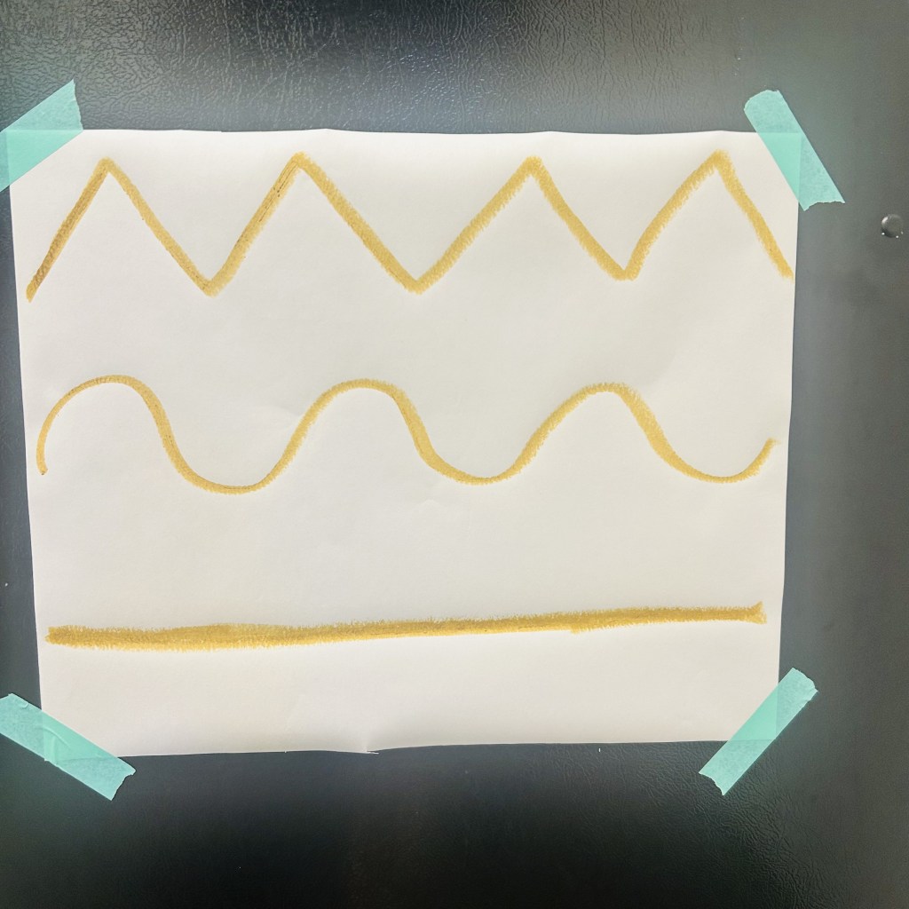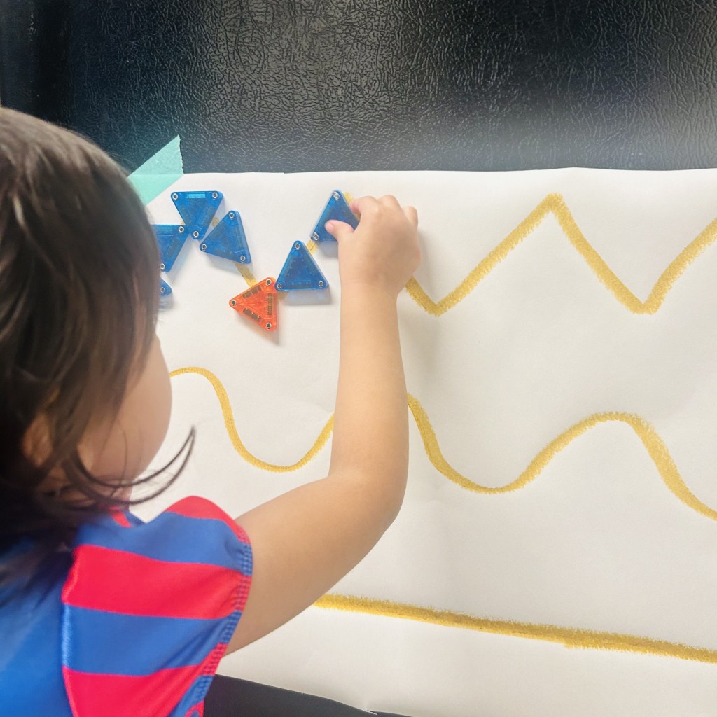 Draw pre writing lines on it i.e. – straight , curvy and zig zag lines and let your child line up magnets on these lines.