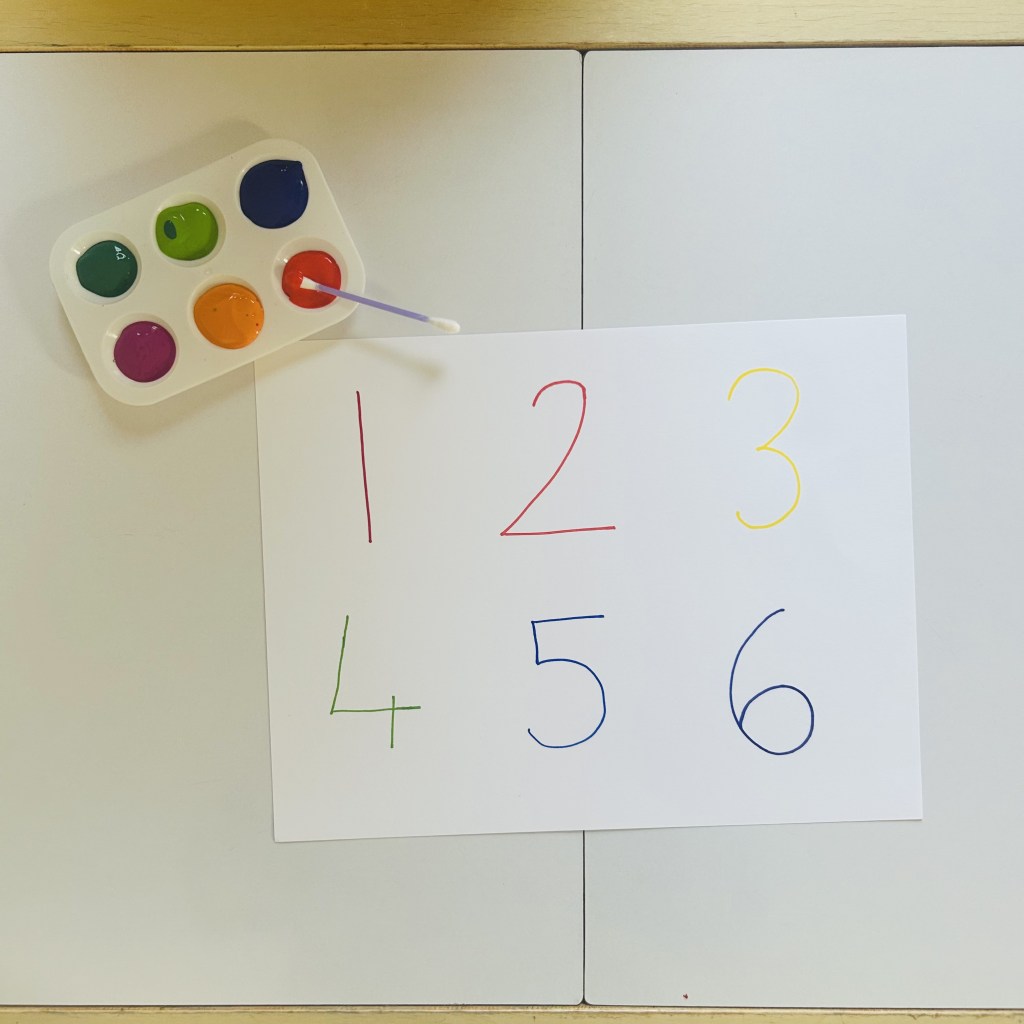 Next , pour some of your child’s favorite color in a plate that is easy for your child to dip the q tip into.
