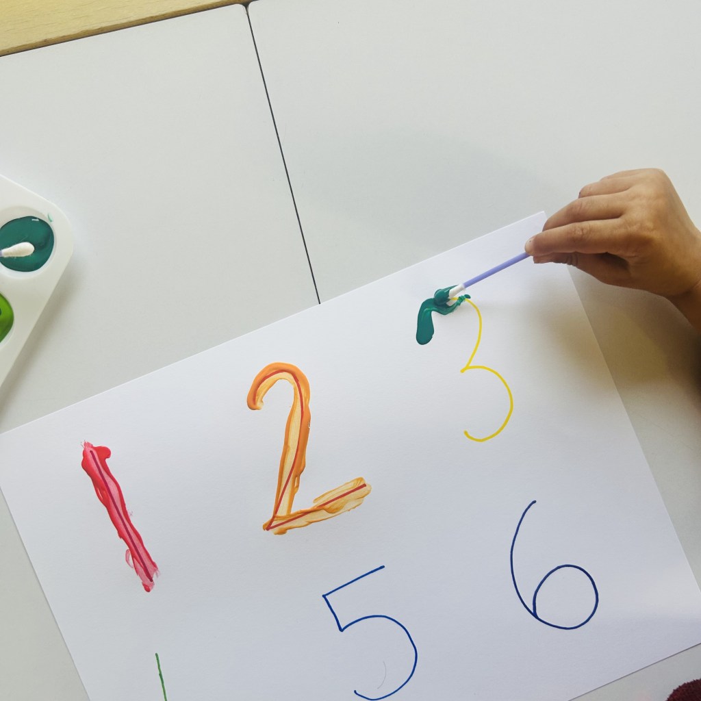 Give your child the q – tip to dip into the tip and then trace over the lines. If you have older kids then instead of pre – writing line you can write numbers , shapes or even alphabets.