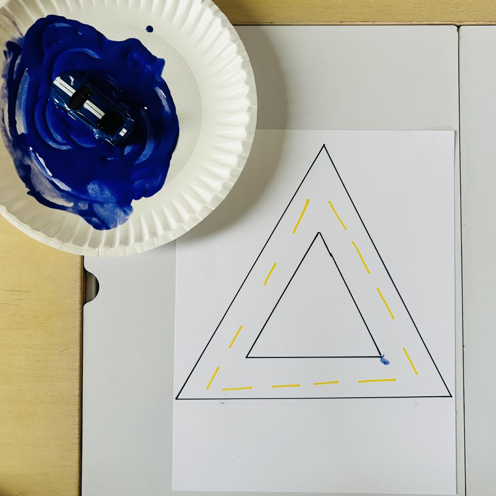 Now , roll the car in the paper plate and trace with this car on any of the shapes , creating a colorful track around the shape.