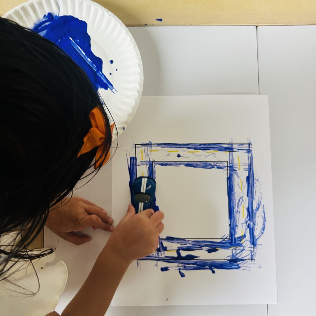 Next , pour the favorite color in a paper plate to roll the cars into.
