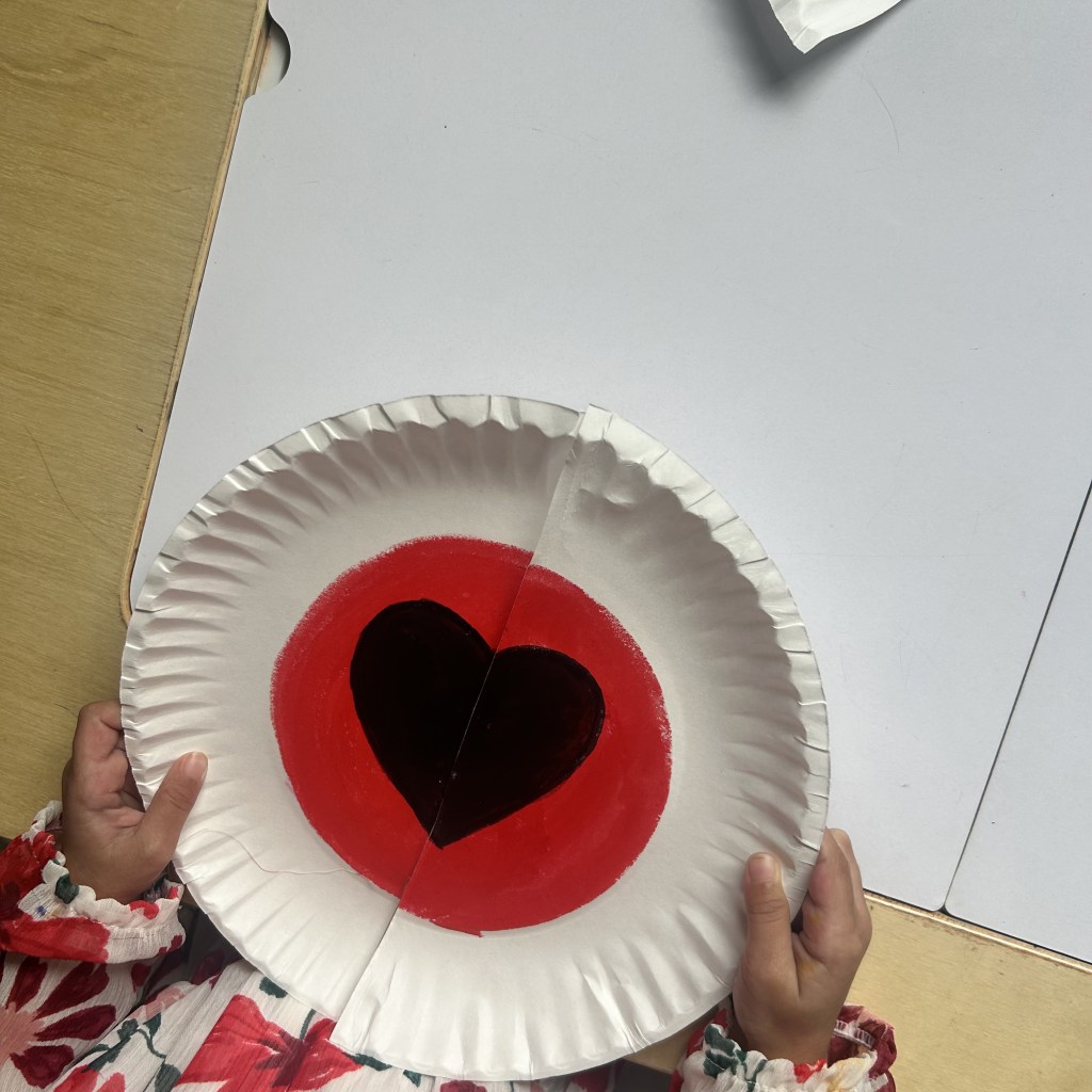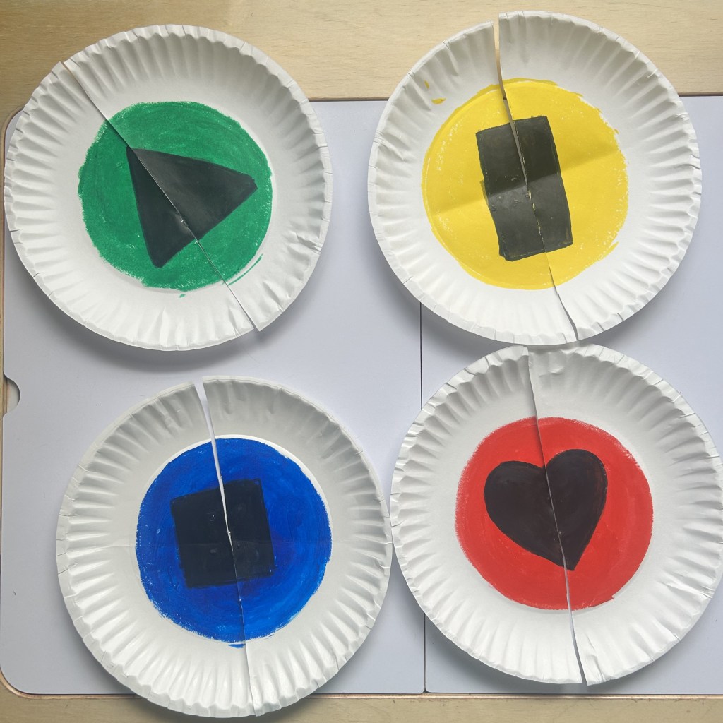 All you need to do is make a shape on paper plate , fill it some color and then cut the paper plate in half , repeat these same steps for 4 -5 different shapes. You can do the basic shapes like –