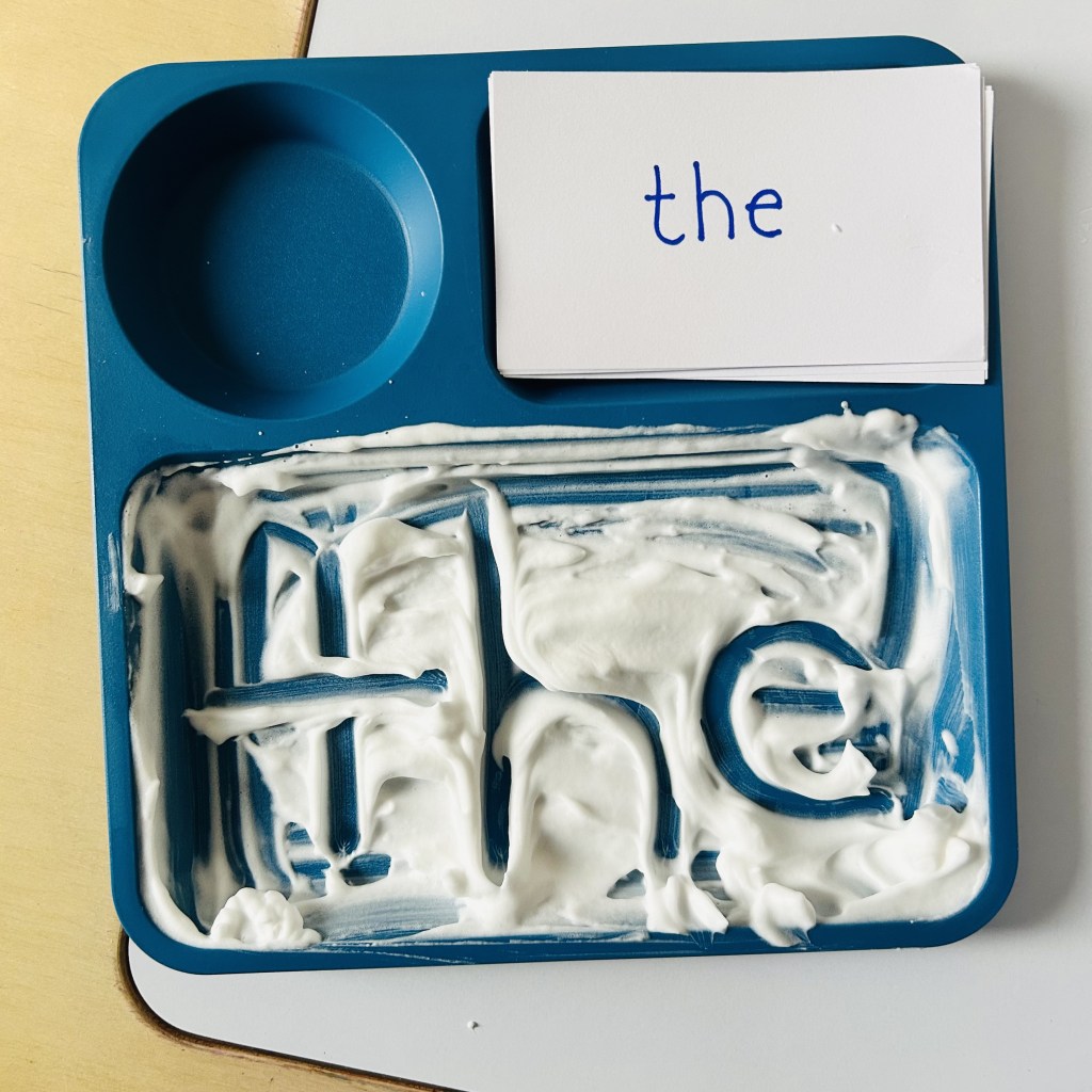 Spread the cream evenly again and practice another letter or word. You can also make your own letter cards for kids to see and write the letter.