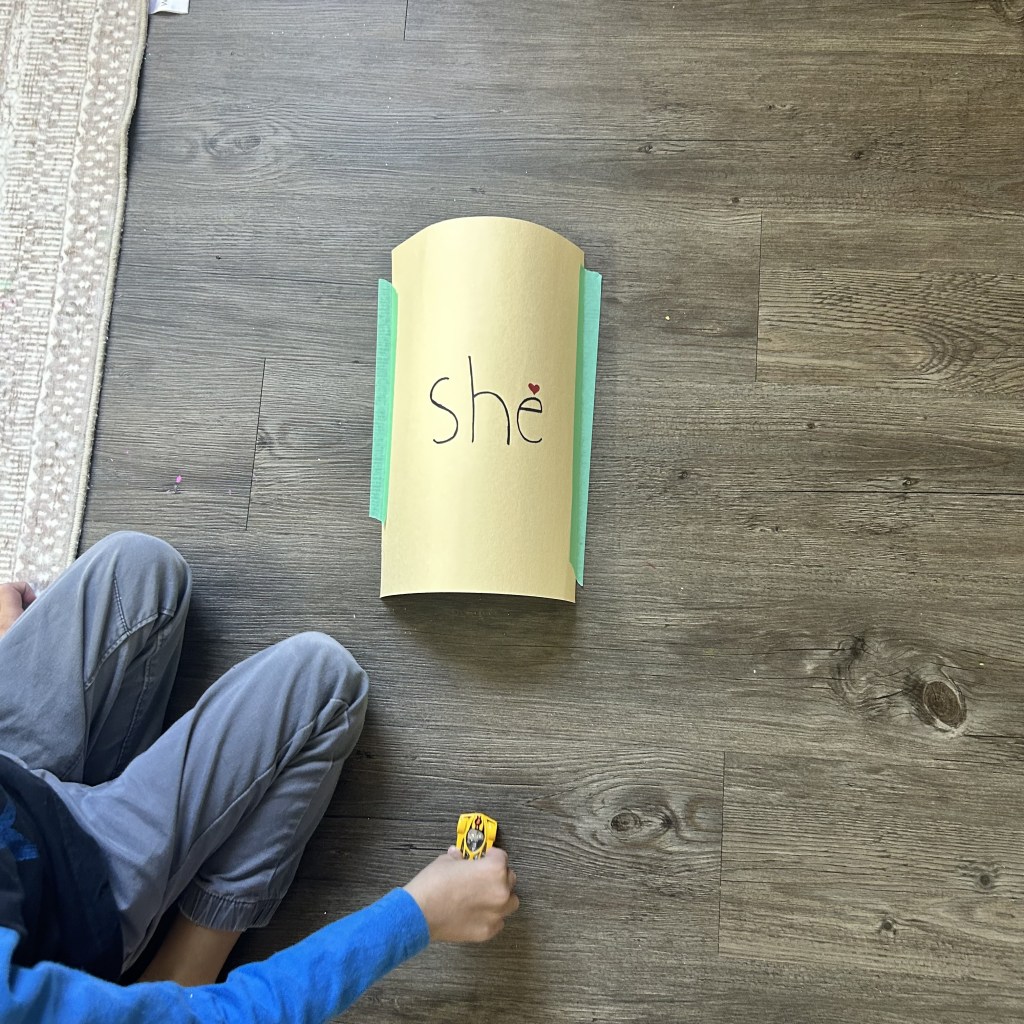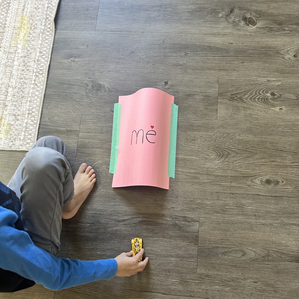 Start by writing sight words on construction paper , one word on one paper and then tape these paper on the floor on the longer side so that it makes a tunnel that is big enough for the toy car to pass through it.