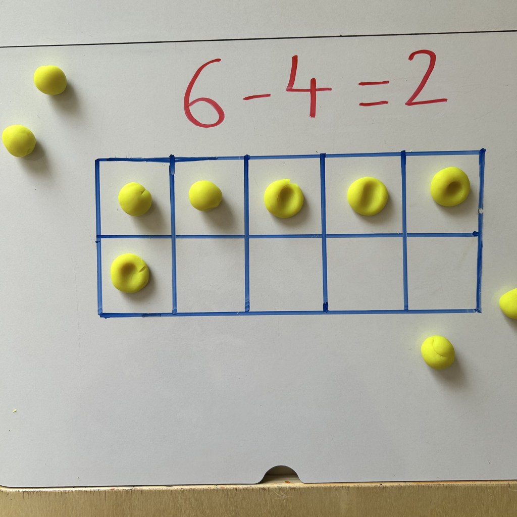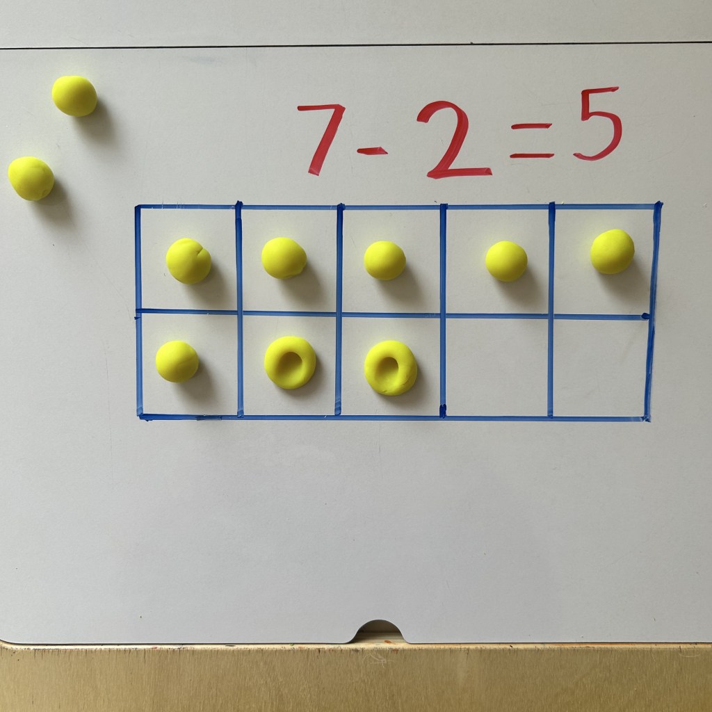 Let’s say the equation is ‘7 – 2 = ‘ , so the child will first fill the ten frame with ‘7’ play doh balls and then smash aka subtract ‘2’ play doh ball and finally count the remaining (not smashed’ play doh balls i.e. 5 in this example.