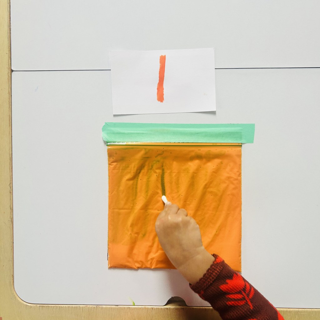 Now begin writing practice by using fingers or q-tips to write on the bag.